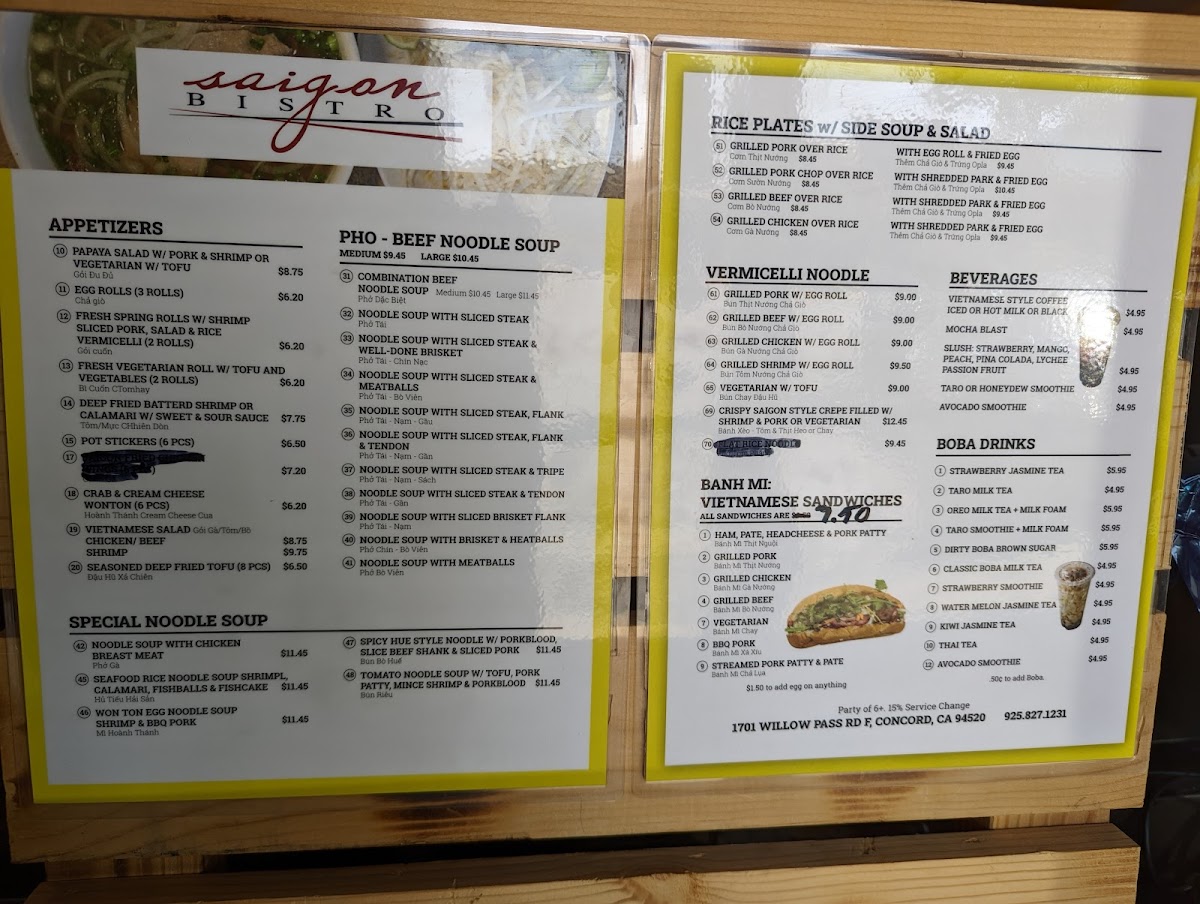 Welcome to Saigon Bistro Concord, a delightful culinary gem nestled in the heart of Concord, California. Located at 1701 Willow Pass Rd F, this bistro offers a vibrant taste of Vietnam that is both authentic and accessible. Known for its diverse menu, Saigon Bistro combines the fresh flavors of traditional Vietnamese cuisine with a friendly atmosphere perfect for take-out and casual dining.